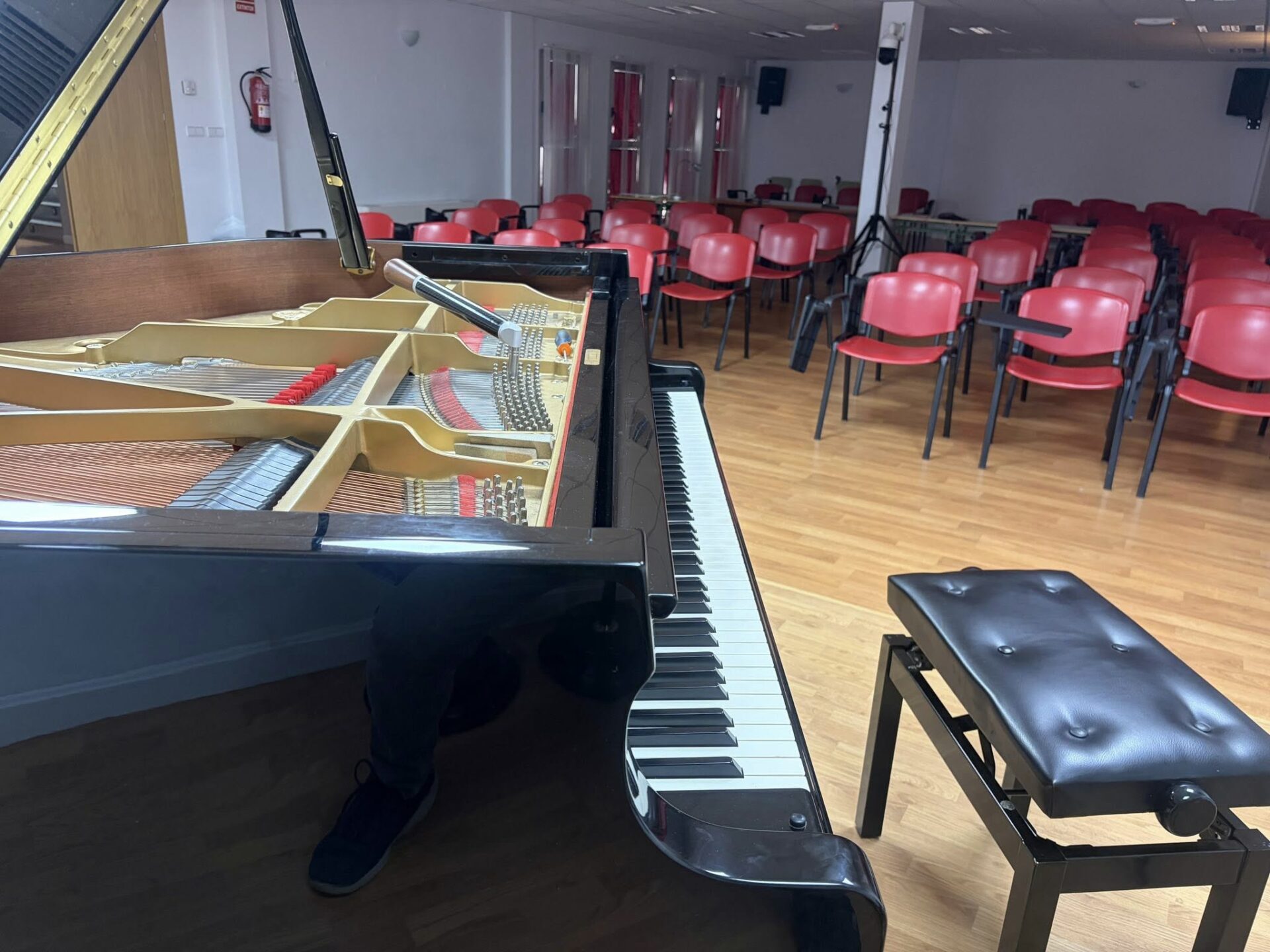 Un año más, me han encargado la afinación y preparación técnica de los pianos, tanto los utilizados en el día a día de la escuela como el instrumento protagonista del concurso. Mantener un piano de escuela en buenas condiciones es una tarea que requiere revisiones periódicas: el uso continuado por parte de alumnos de distintos niveles, los cambios de temperatura entre estaciones y el desgaste natural de la mecánica hacen necesario un mantenimiento regular para garantizar que el instrumento sea una herramienta de aprendizaje fiable y agradable de tocar.